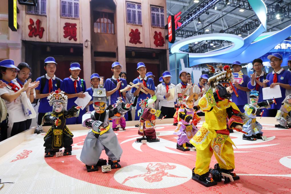 5月23日,学生在文博会上观看机器人表演英歌舞。新华社记者梁旭摄