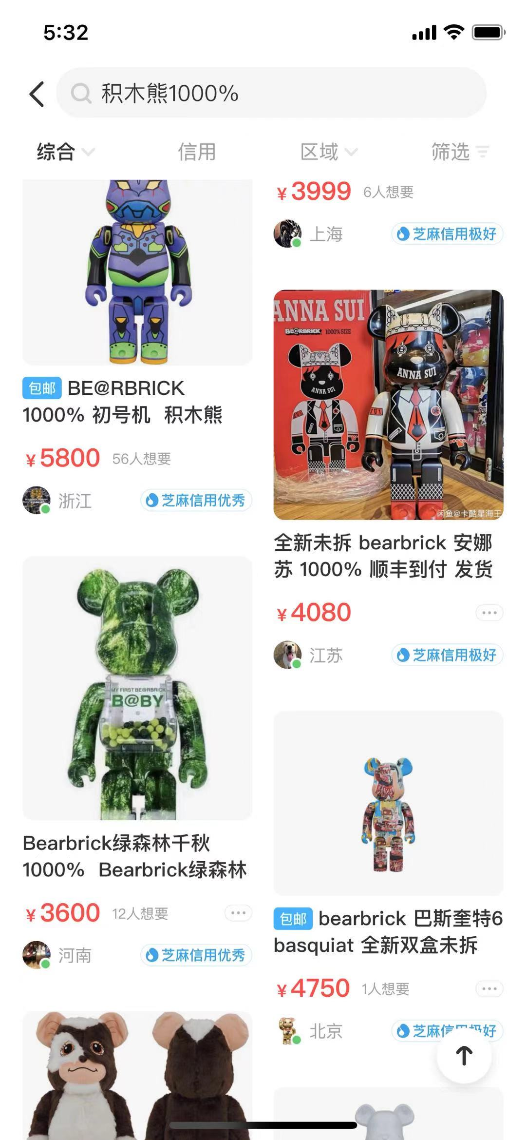 当然,平台上也有一些用户进行售卖,价格也是从100元到10万元以上不等。其中,1000%规格的积木熊最受欢迎。